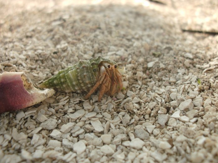 I spent last week in Belize, and while messing with the hermit crabs on the beach, I had a series of John Muir style observations. It started with the realization that hermit crabs are asymmetric. They have a definite lean to them. Their legs and claws are shaped in such a way that when they snap into the shell they’ve chosen as their personal armor, their body completes the spiral of the shell. You can see this fairly clearly in the picture I took of the cutest hermit crab ever, which should be easy enough to distinguish from the picture of the biggest and ugliest hermit crab in the world, which I was also lucky enough to find.